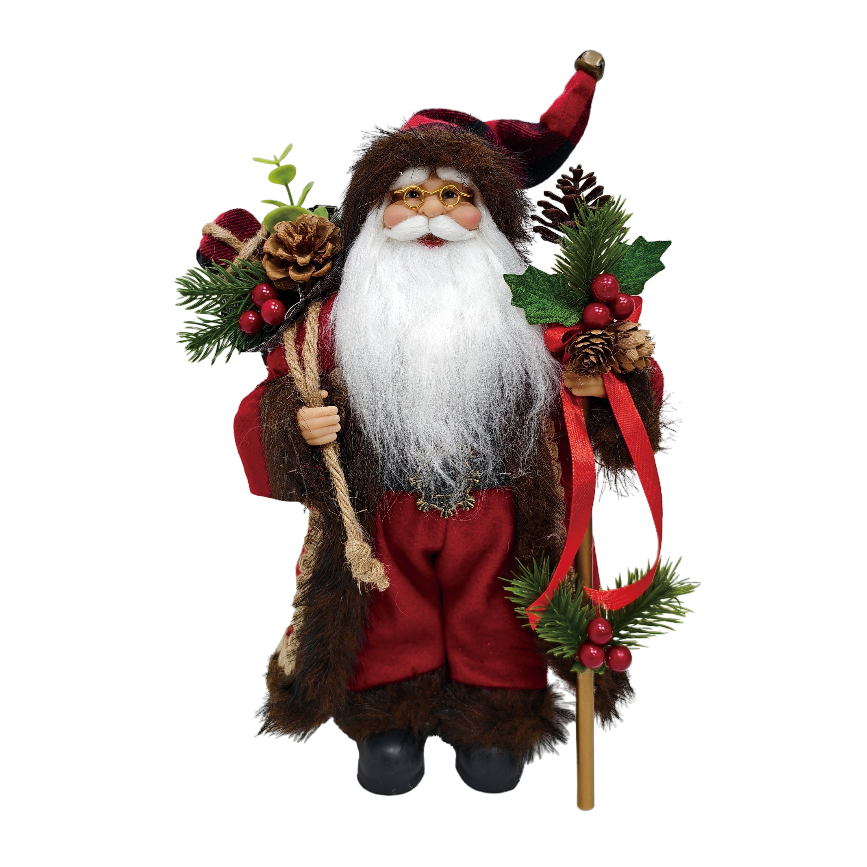 12" STANDING SANTA IN RED BLACK HOLDING A STICK & GIFT BAG