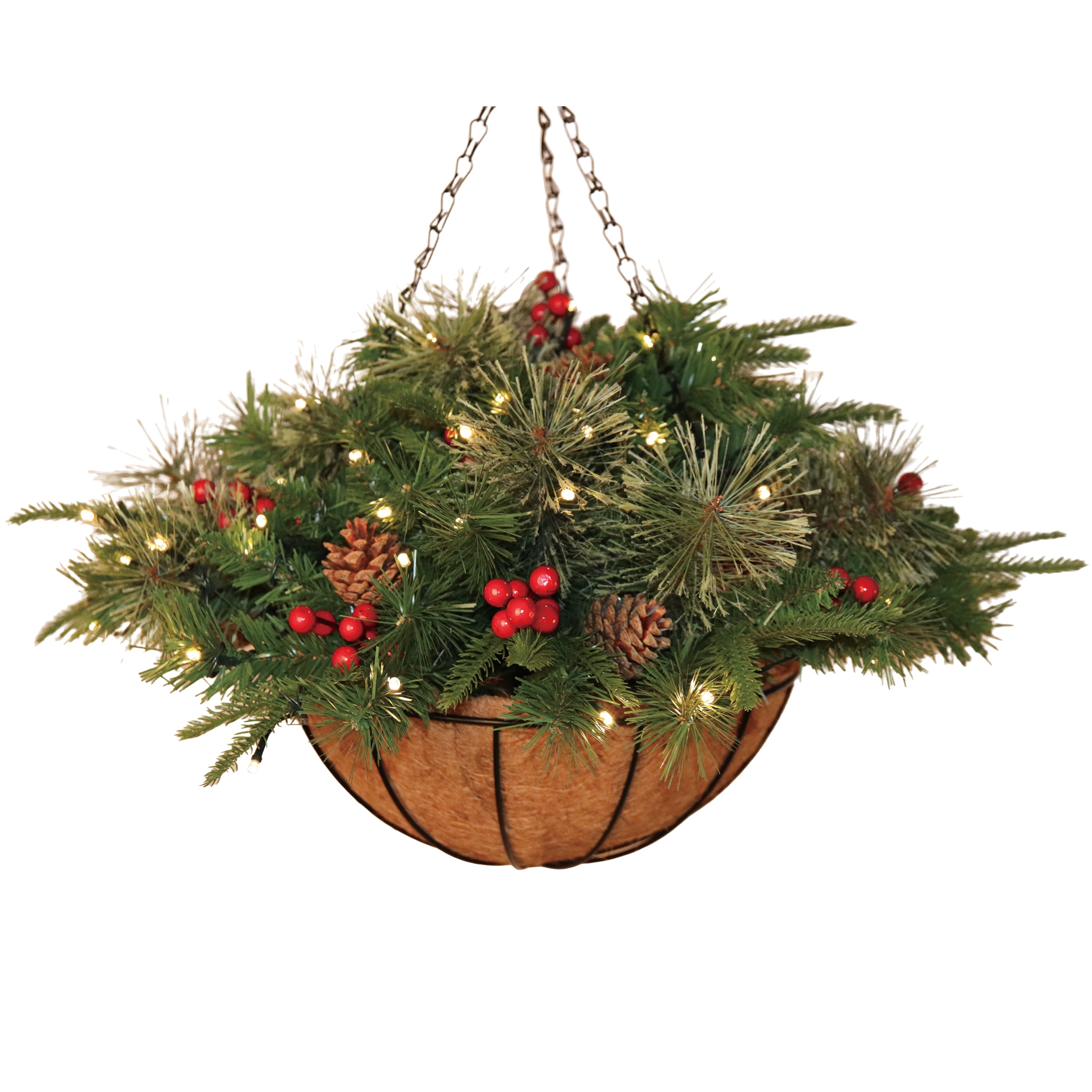 16" Flower Baslet,60 branches, mixed PVC+PE+pine needles,30LED Lights with battery box, with pine cones and red berries