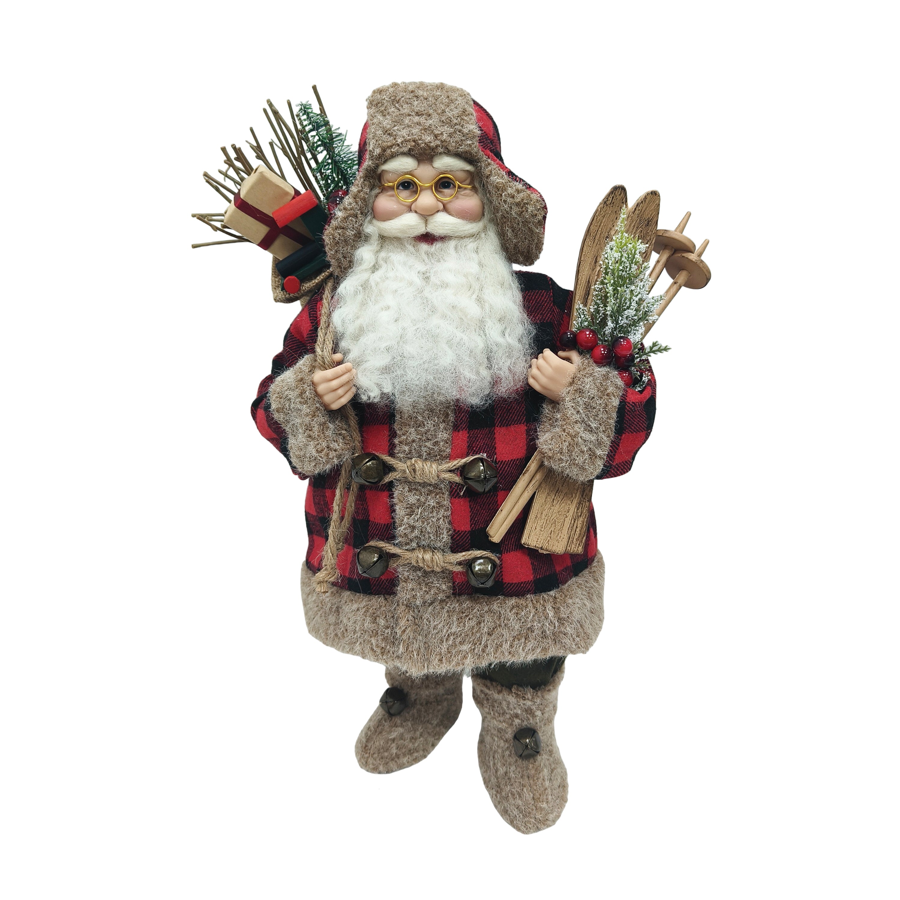 18" WALKING SANTA IN PLAID KHAKI HOLDING A SKIS & SACK