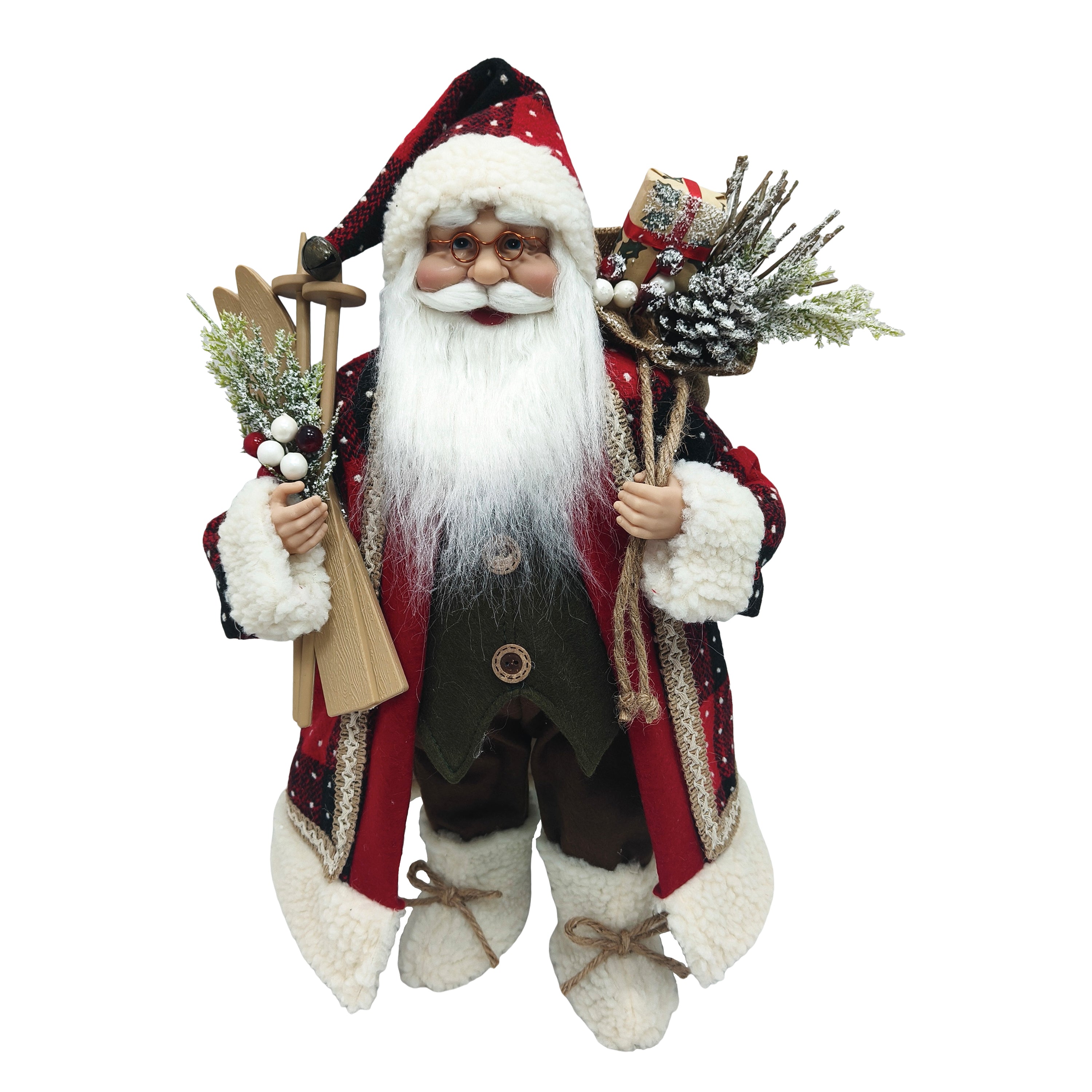 18" WALKING SANTA IN RED GREEN HOLDING A SKIS & SACK