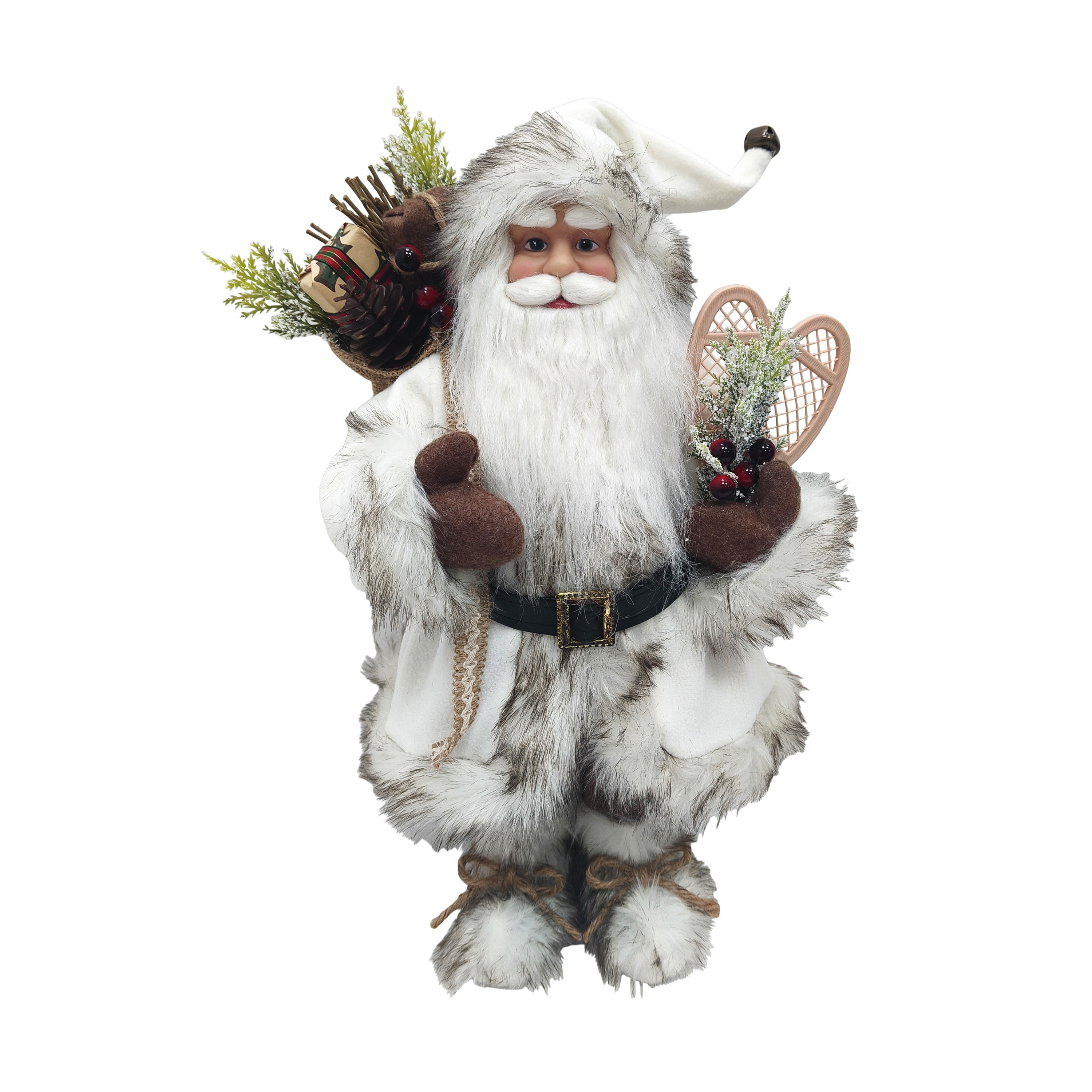 18" WALKING SANTA IN WHITE BROWN HOLDING SNOWSHOES & SACK