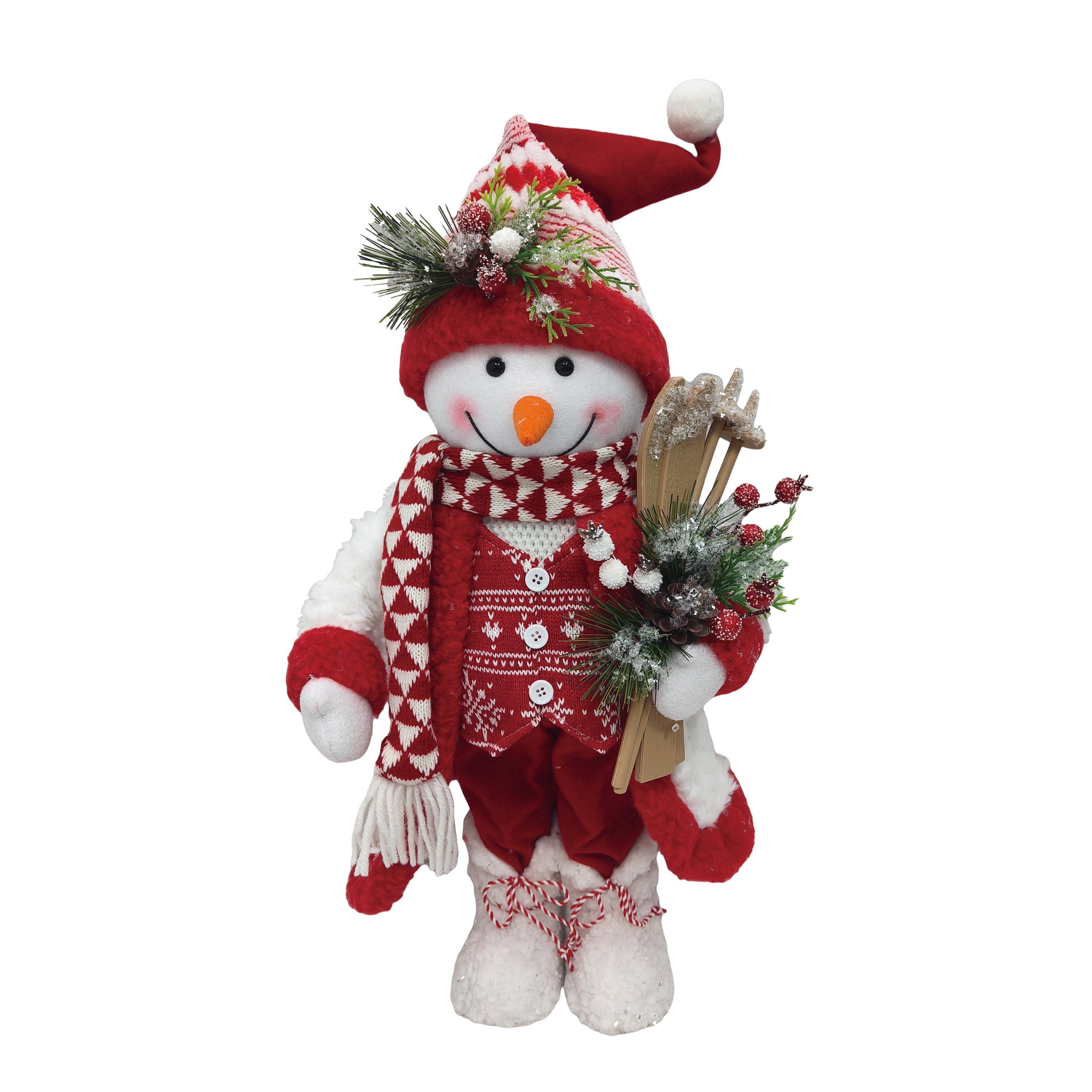20" STANDING SNOWMAN IN RED WHITE HOLDING SKIS