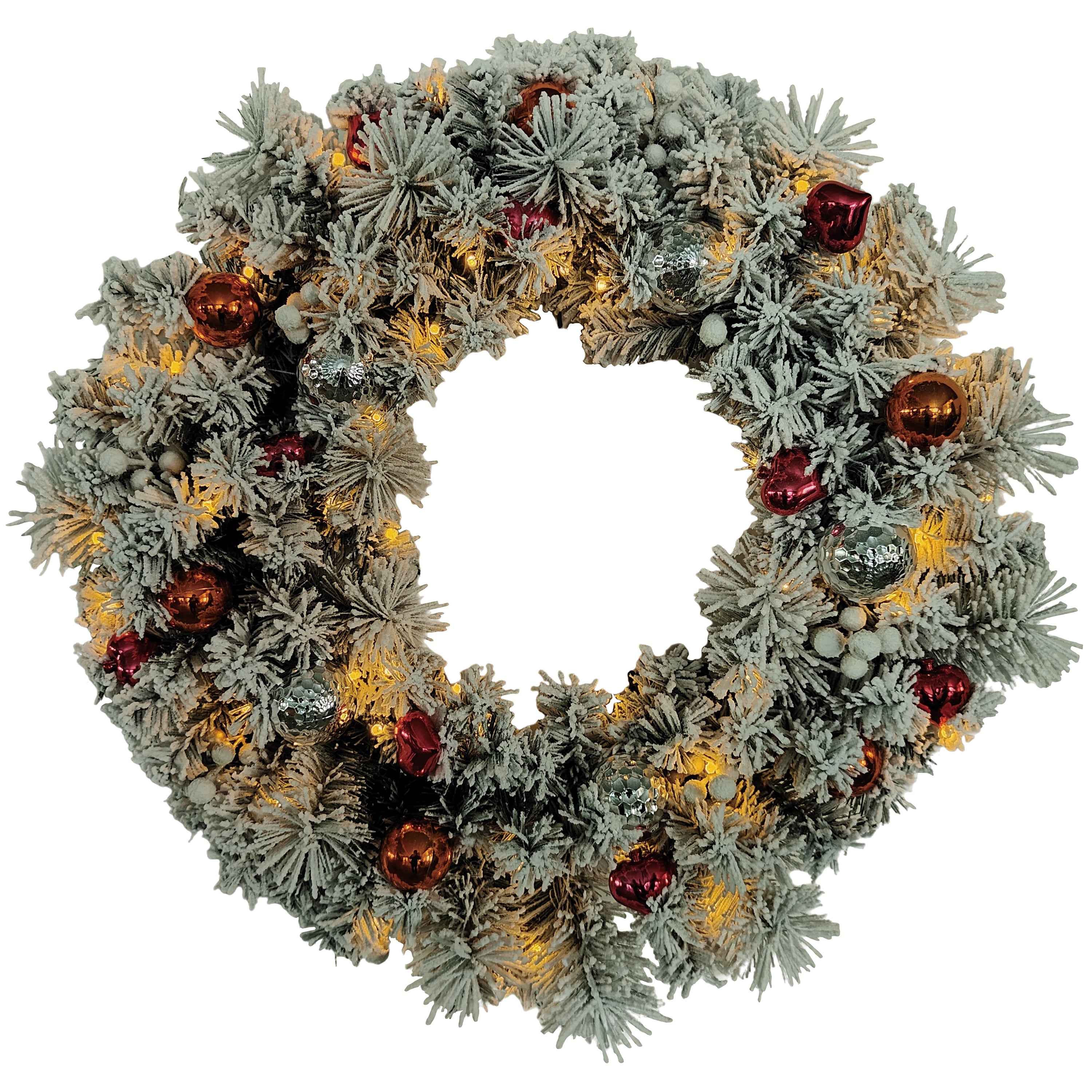 24" Flocked 120 tips, PVC+pine needle wreath with Christmas balls equipped with 50LED warm white LED lights waterproof batterybox(8 functions) Christmas balls*20,red berries*8