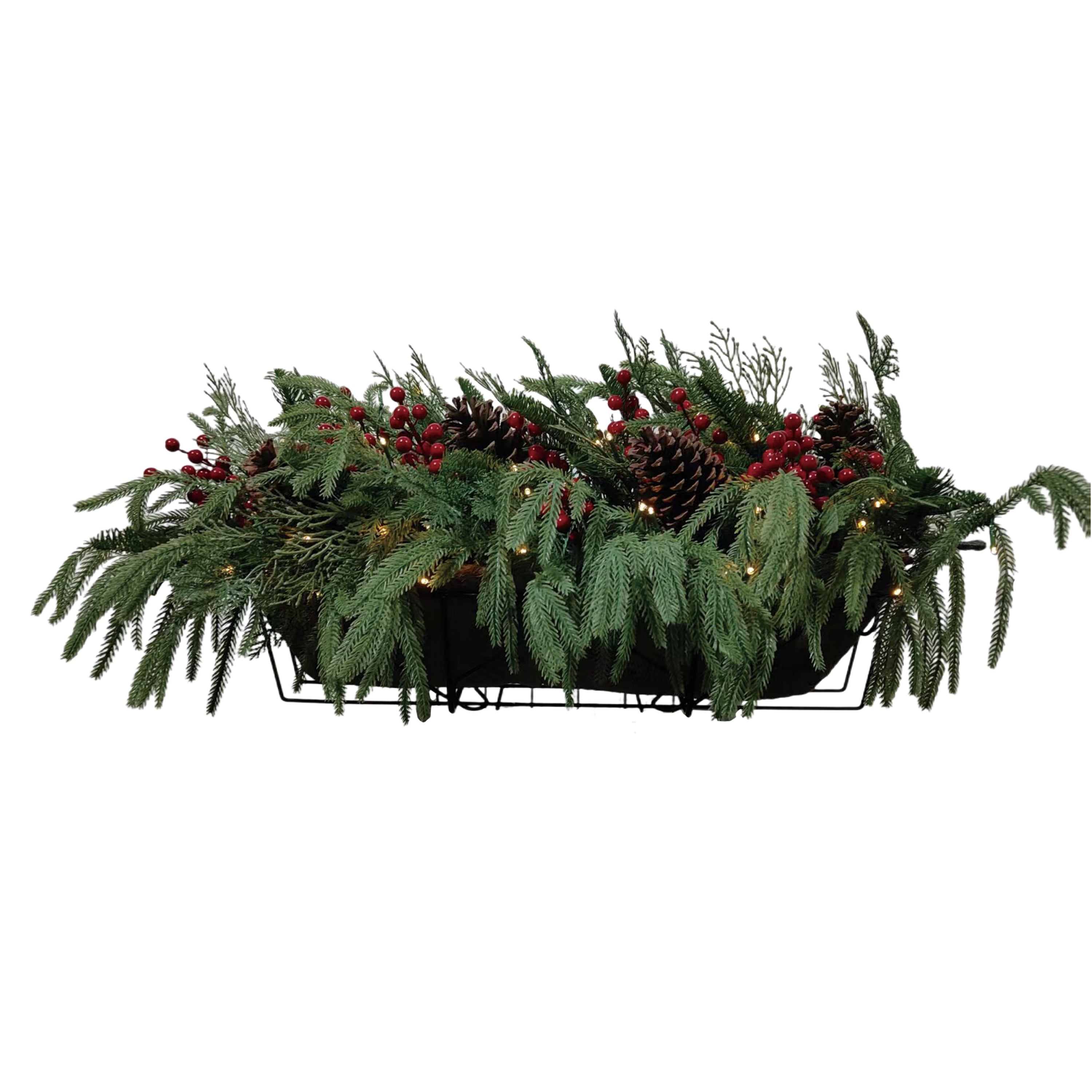 32" Christmas Window Box Arrangment, PE+Pine needle material 80tips 4 pine cones+4 red fruits70 warm white LED lights with waterproof batterybox(8 functions)