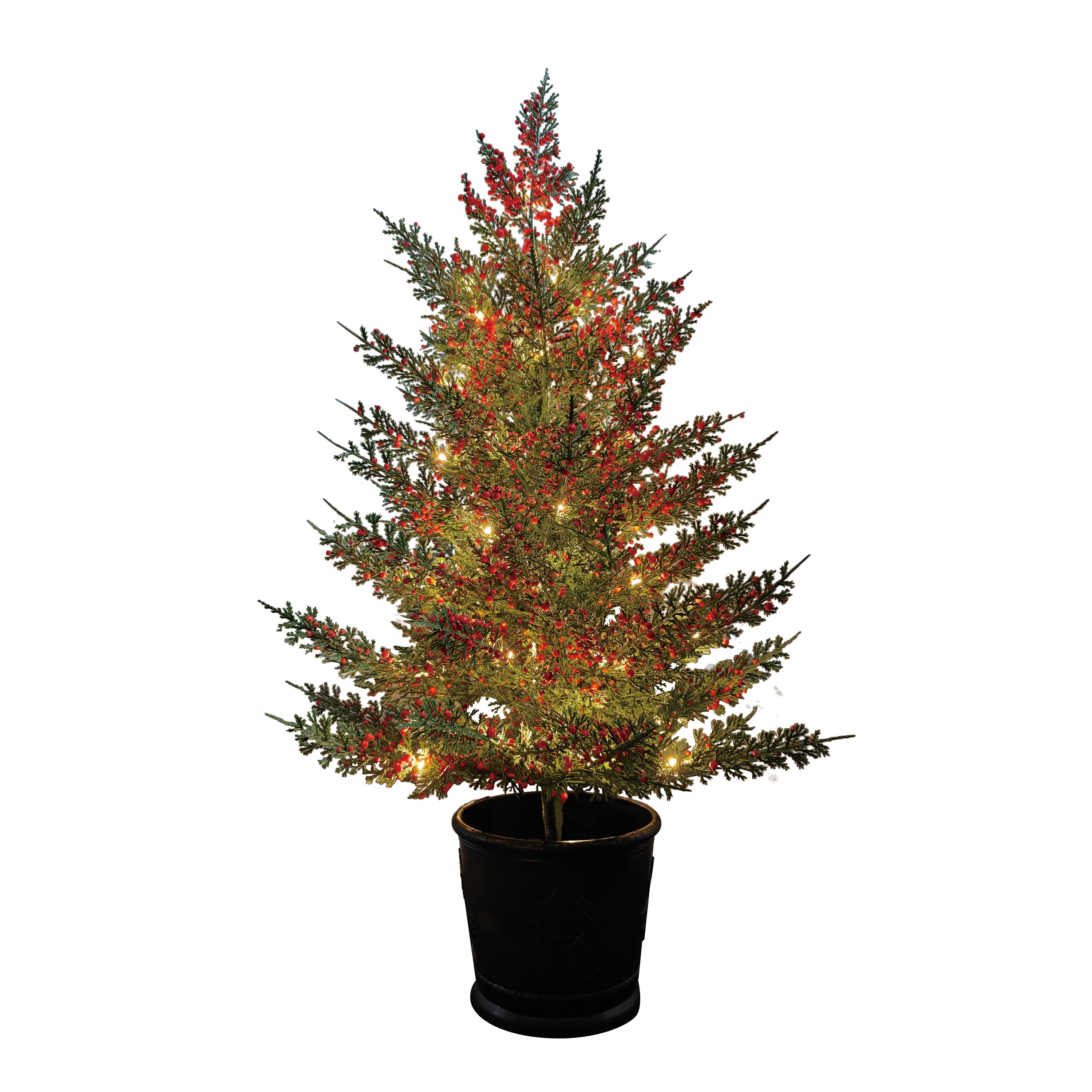 3FT Potted Cedar Berry tree PE material w/ red berries. 90 WW LEDs. 3AA waterproof battery box, timer 8 On 15 Off