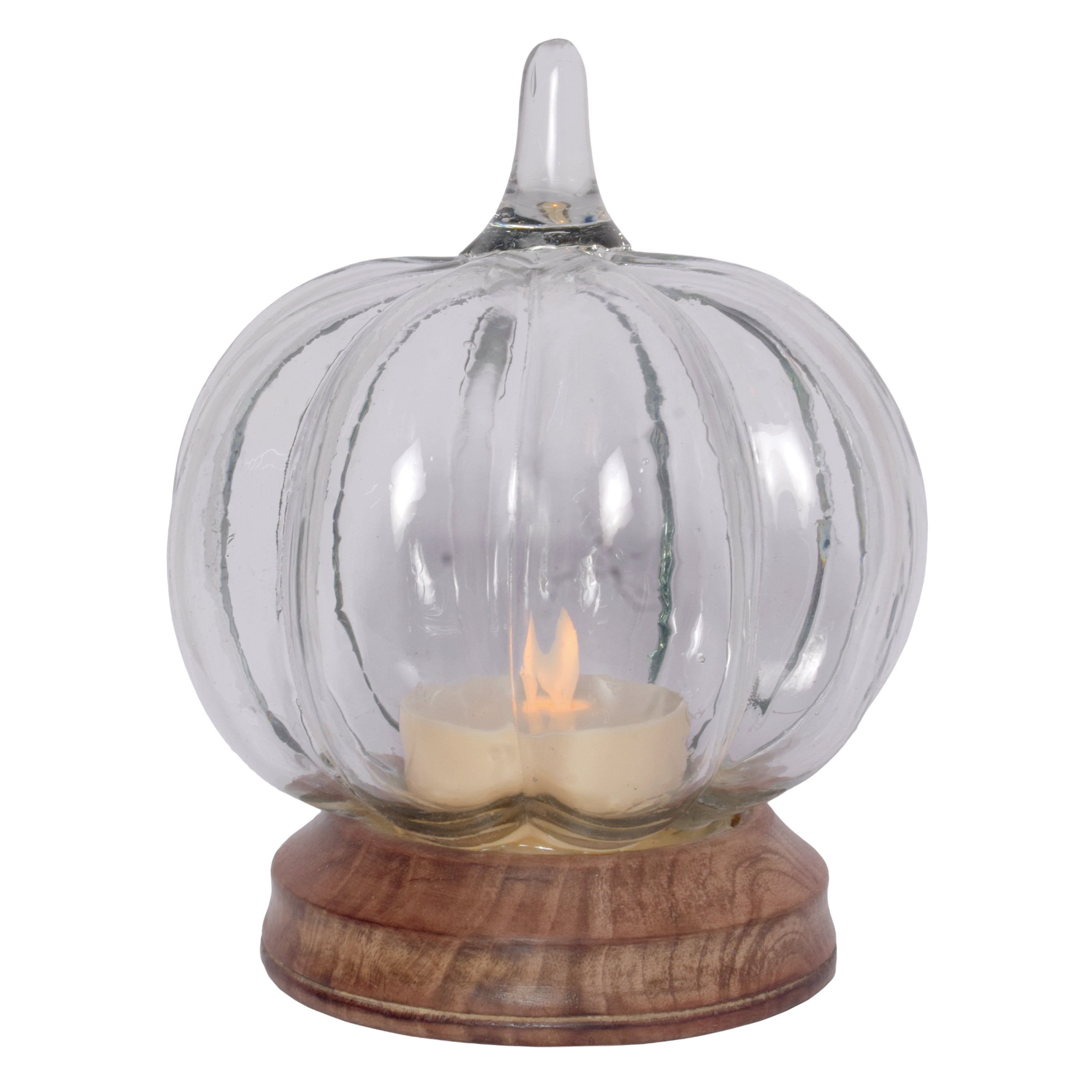 7" Glass LED Clear Pumpkin on Wood Base