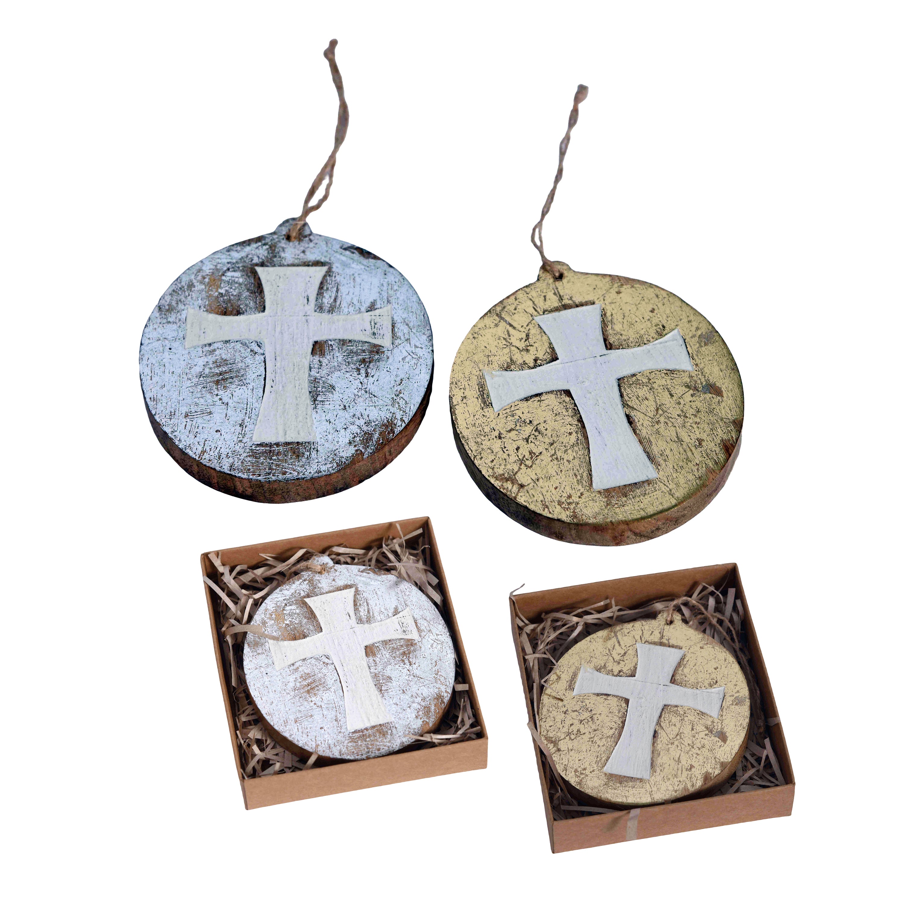 Wood Disc Cross Orn w/Metallic in Box 2 Asst