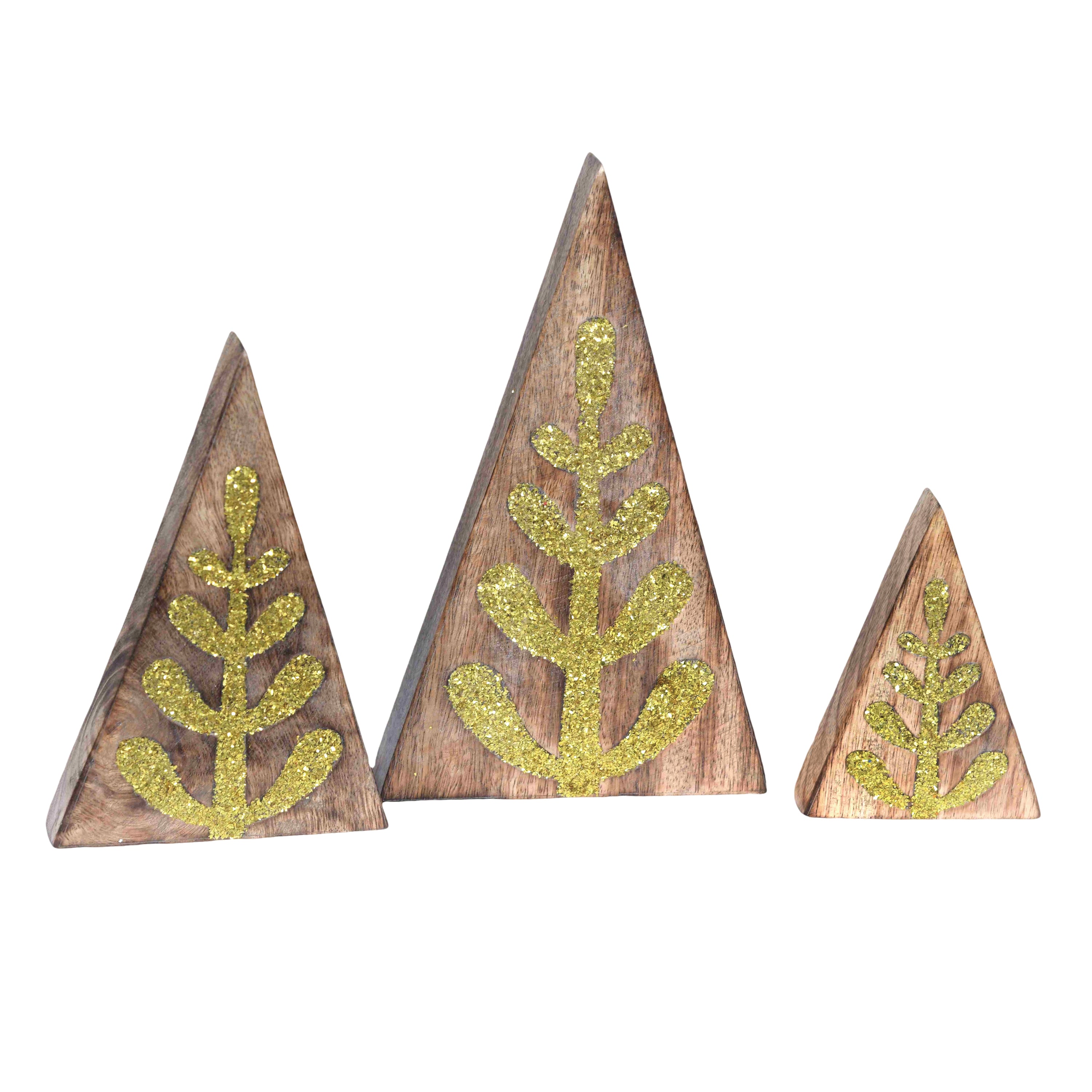 Wood Triangle Trees w/Gold Glitter S/3